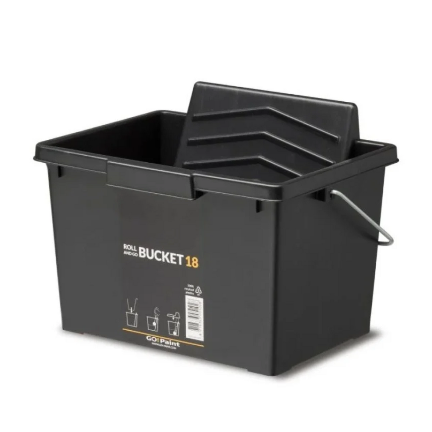 The Roll & Go Paint Buckets are sturdy paint trays with the characteristic sloped rolling surface. This size is suitable for all types of paint and varnish rollers of up to 18cm (7"). No more splashes or dried-on paint particles, as can happen with a separate paint rolling grid. Can be used and cleaned faster. Made from 100% recycled plastic.